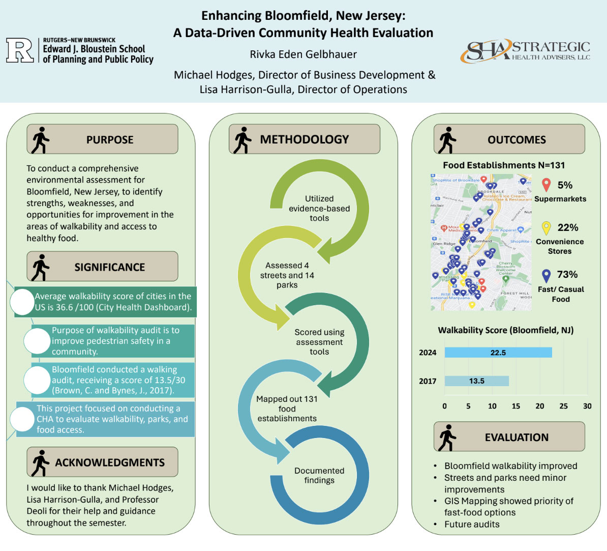 My internship at Strategic Health Advisers was deeply rewarding. Coming from a health administration background, delving into public health showed me its significant impact on our daily lives, especially during events like the COVID-19 pandemic. This experience heightened my appreciation for the dedication of public health workers and sparked a newfound interest in pursuing a career in public health or healthcare consulting. I'm excited to apply the skills and knowledge gained from this internship to future opportunities. Working on various projects at Strategic Health Advisers, such as conducting built environment assessments and developing a training PowerPoint on Group A Strep, expanded my skill set and deepened my understanding of public health practices. Overall, this internship not only improved my expertise in data analysis and project management but also instilled a strong sense of purpose within me for the public health sector. I'm grateful for the chance to contribute to meaningful initiatives and am eager to continue making a positive impact in this field.